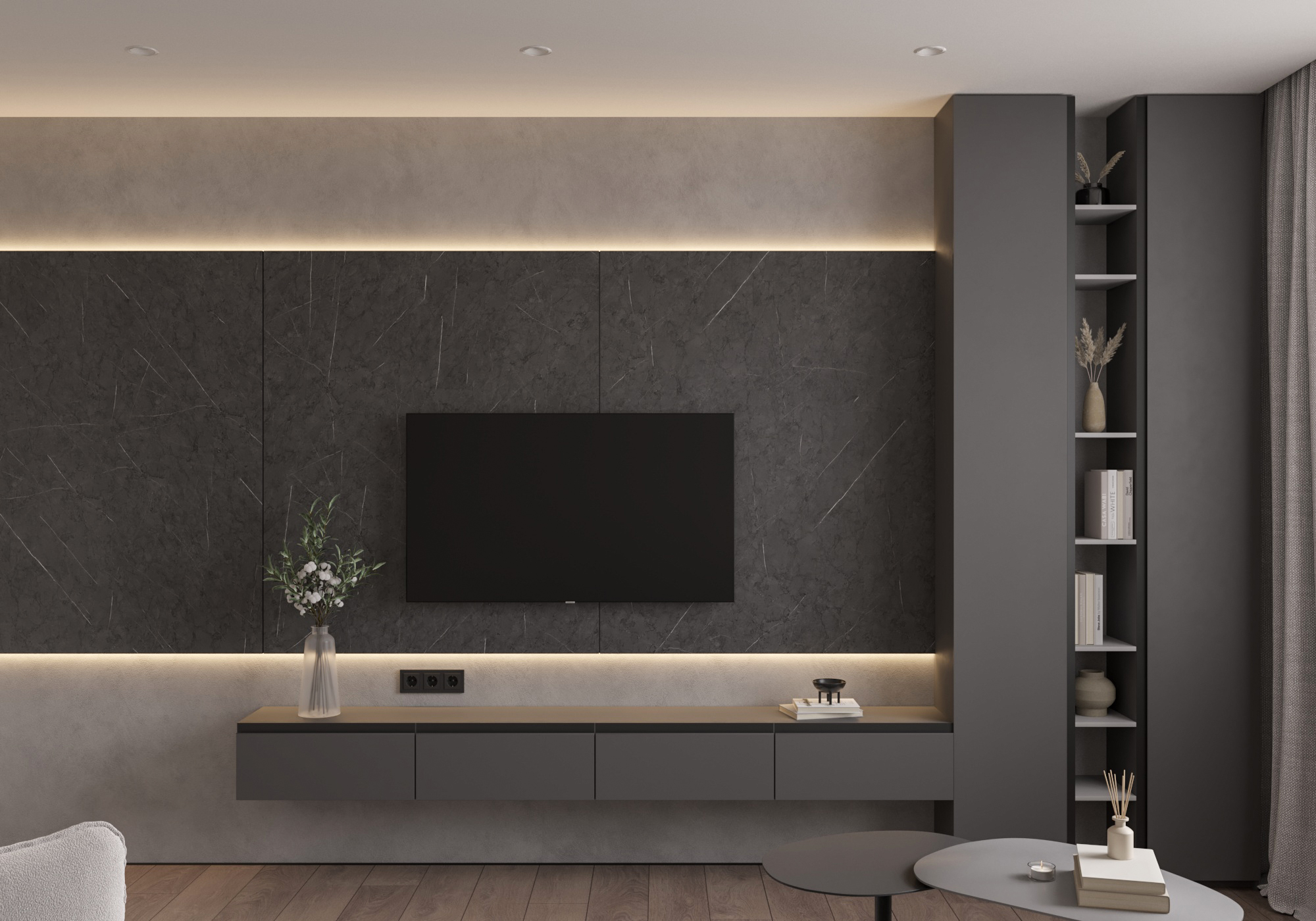 While developing the furniture plan, we tried to implement all the wishes of the customers, but there was one difficulty - we had no place to place the TV in the living room area, because the sofa was opposite the window. Therefore, we came up with the idea of making a sliding partition on which we mounted the TV. It is perfectly visible on the visualization.