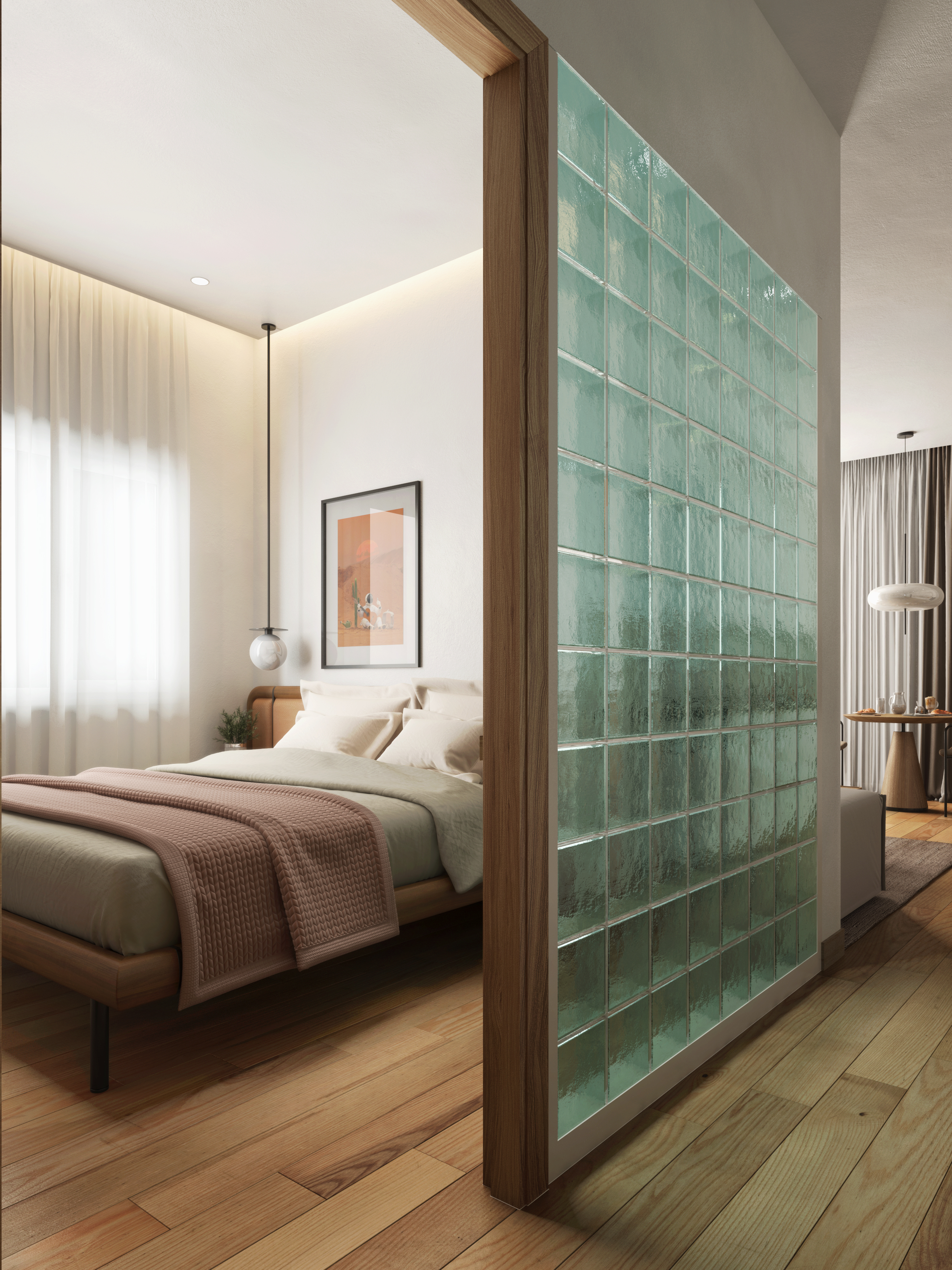 Small bedroom uses translucent bricks to both highlight and light up the hallway