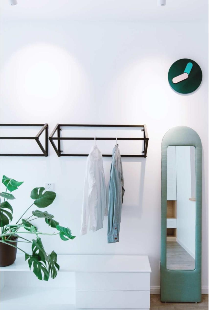 Because there is a large cloakroom in the home, in order to have a large space in the second bedroom, only a wall hanging hanger is set up opposite the bedside, and no wardrobe is made