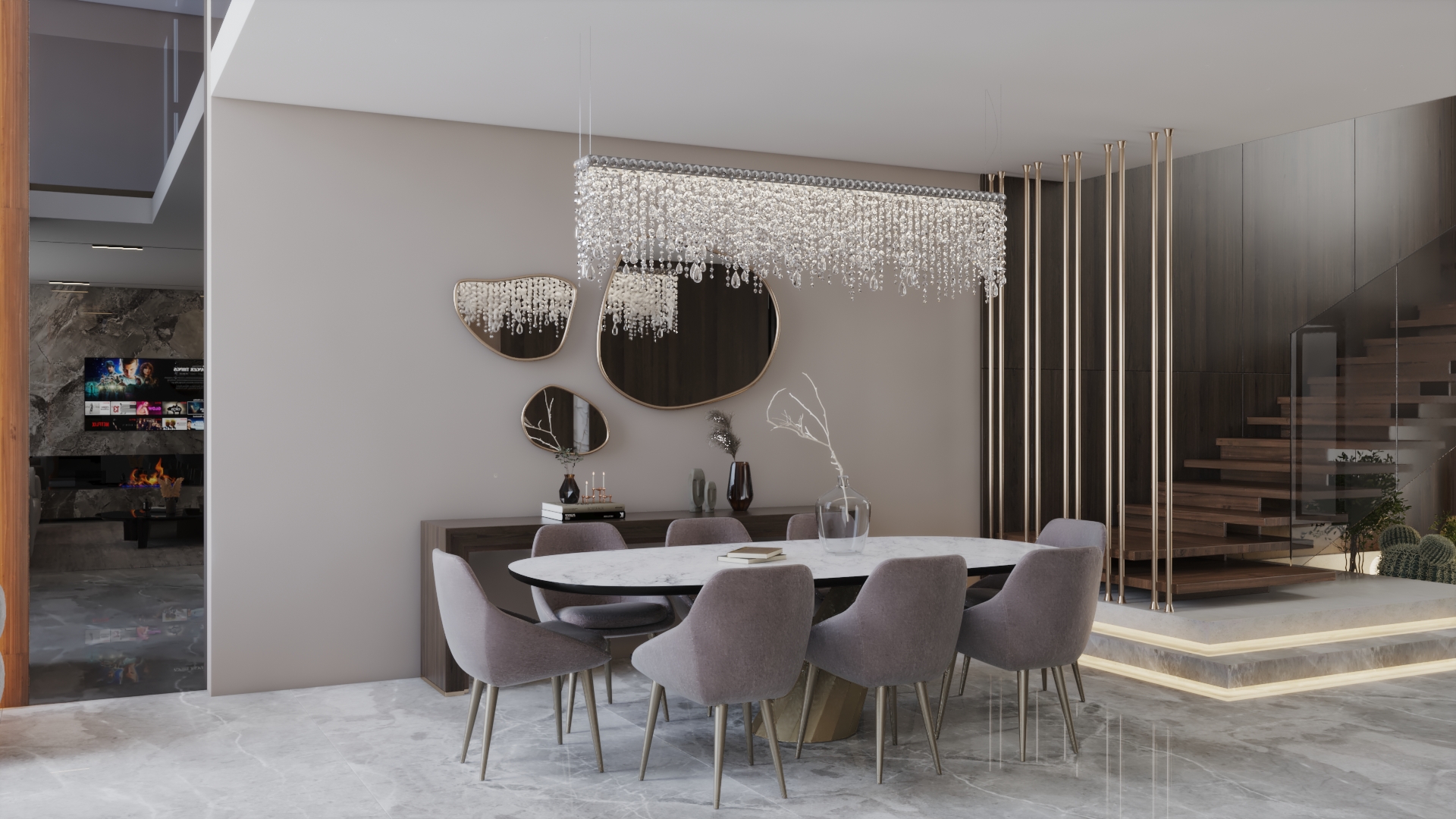 The dining table area combines an organic mirror style with luxurious pendant lighting.