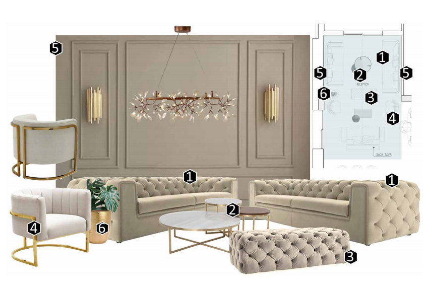 Content:GRP/Futec wall panels Capitone Sofas and banquette Stainless Gold appliques.