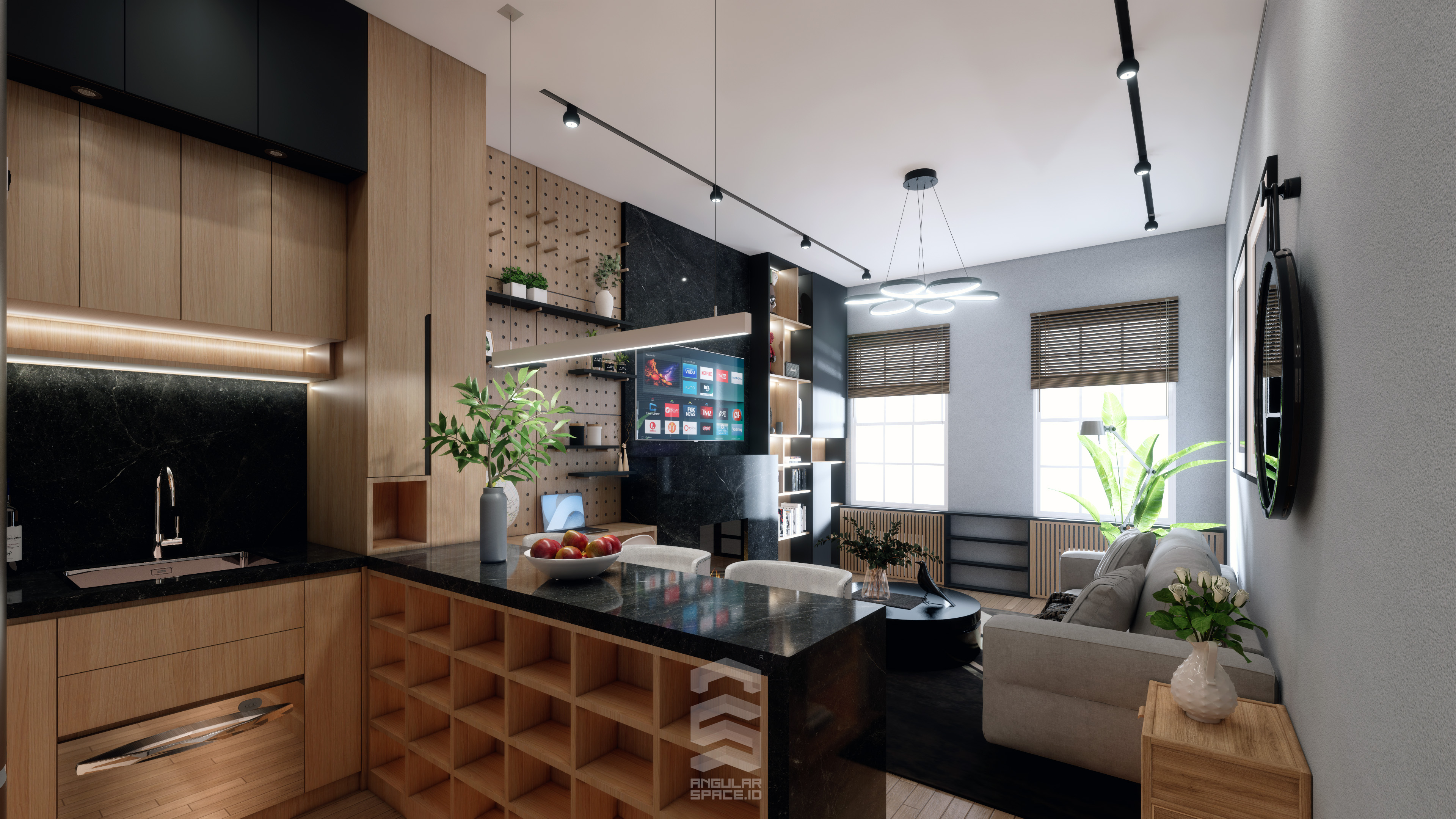 This interior uses a modern concept with a combination of light wood and black doof colors.