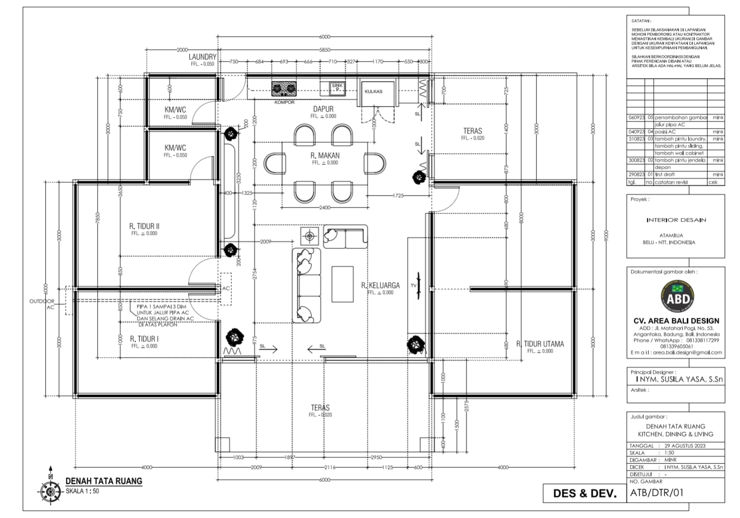 Interior design for living room, dining room and kitchen. The concept is modern style. The project location is in Atambua city, East Nusa Tenggara, Indonesia. Under construction now.