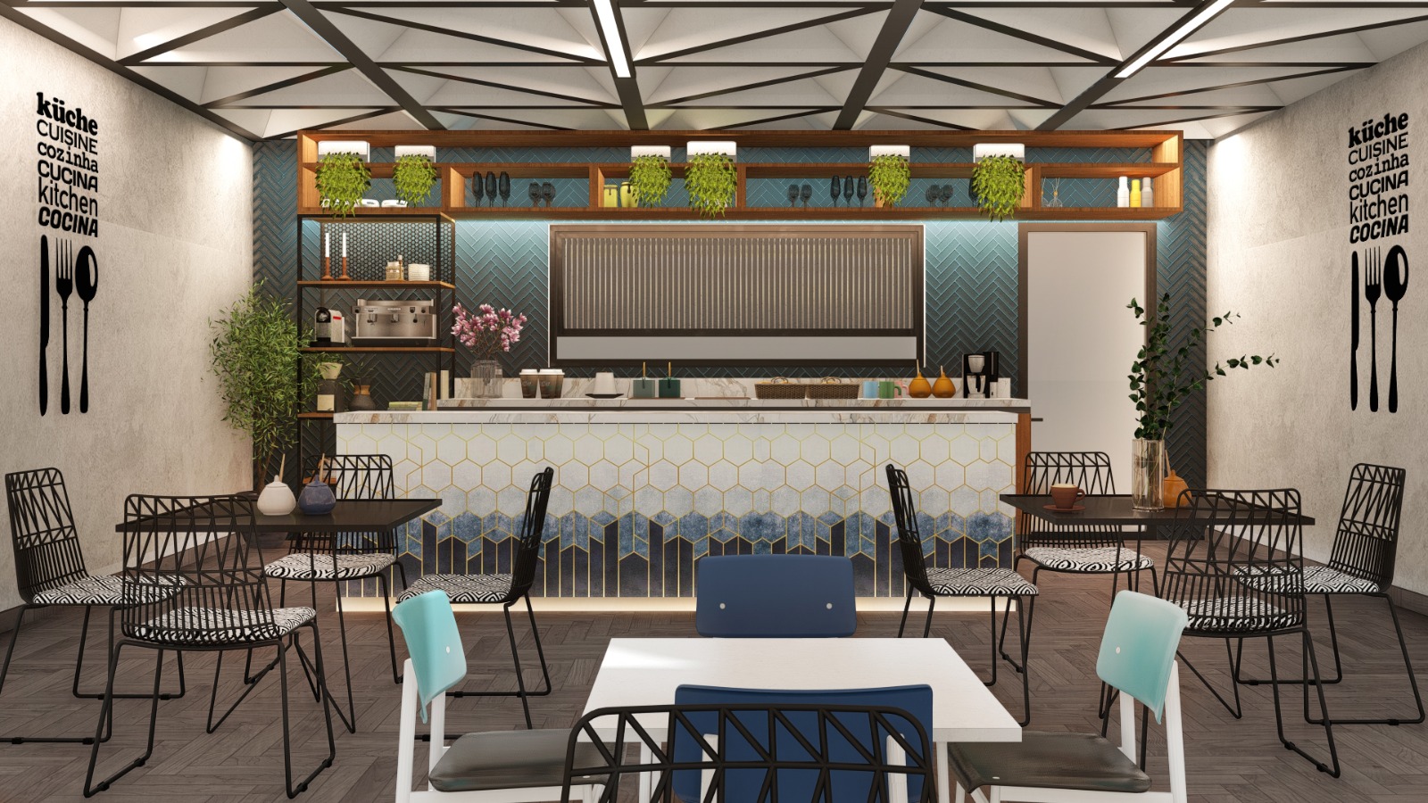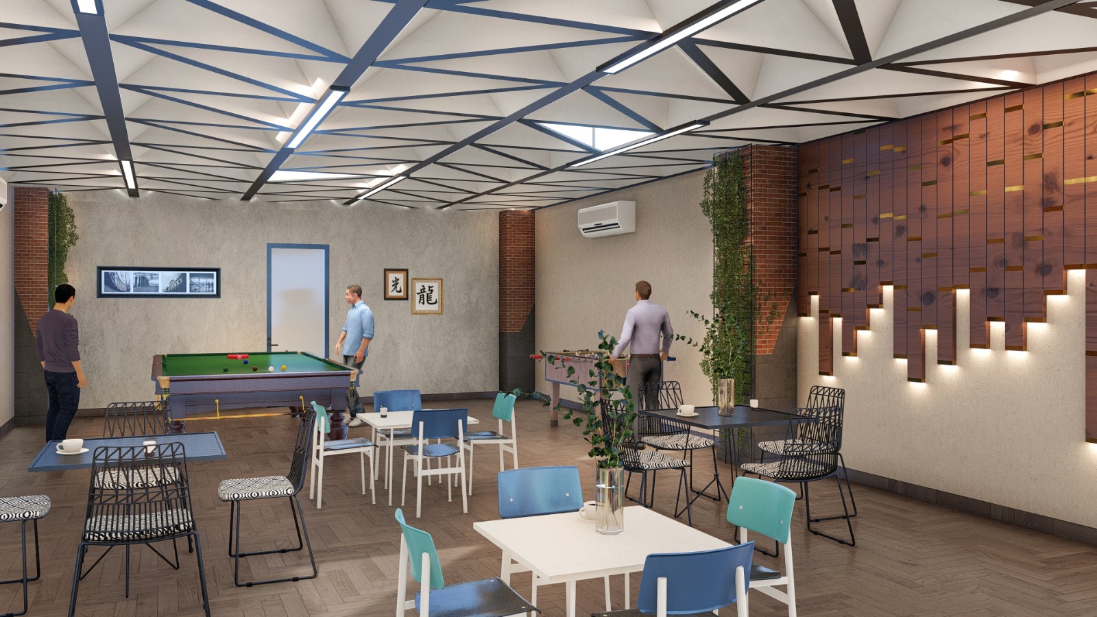 The entrance bar will feature dark wood, marble countertops, and leather seating to create a warm, elegant atmosphere. Ambient lighting and a central bar layout encourage social interaction, offering a stylish space for guests to unwind with curated beverages.