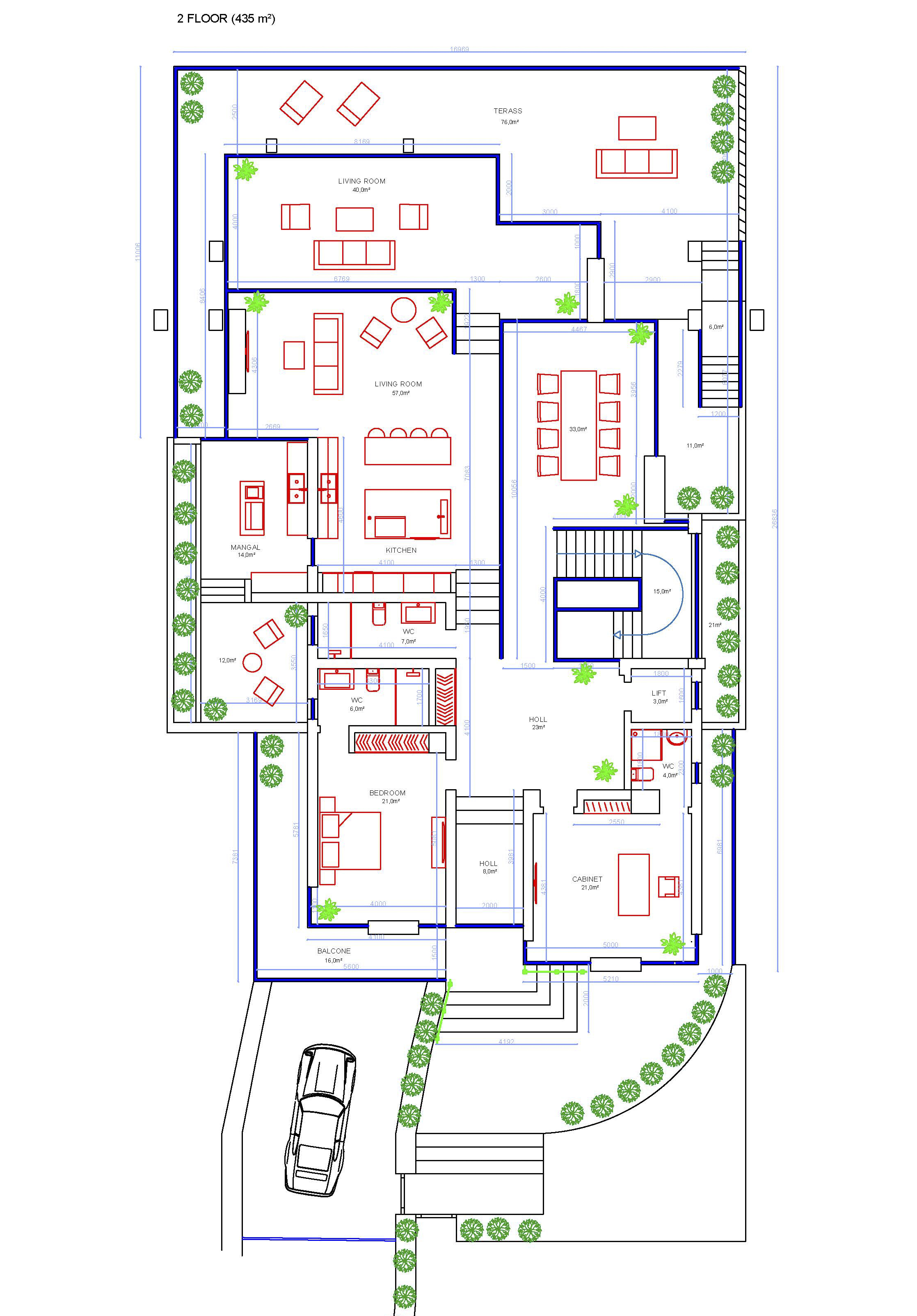 Plan of the villa on the 2nd main floor, design of a beautiful interior and a large number of rooms