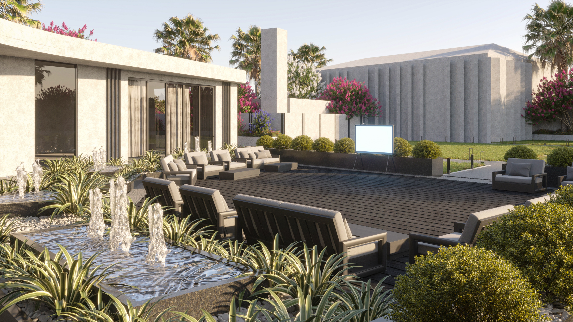 Modern outdoor seating area designed for relaxation and entertainment. The setup features a spacious wooden deck surrounded by well-manicured greenery and decorative fountains, creating a serene atmosphere. The surrounding pathways and clean landscaping enhance the elegance and functionality of the space.