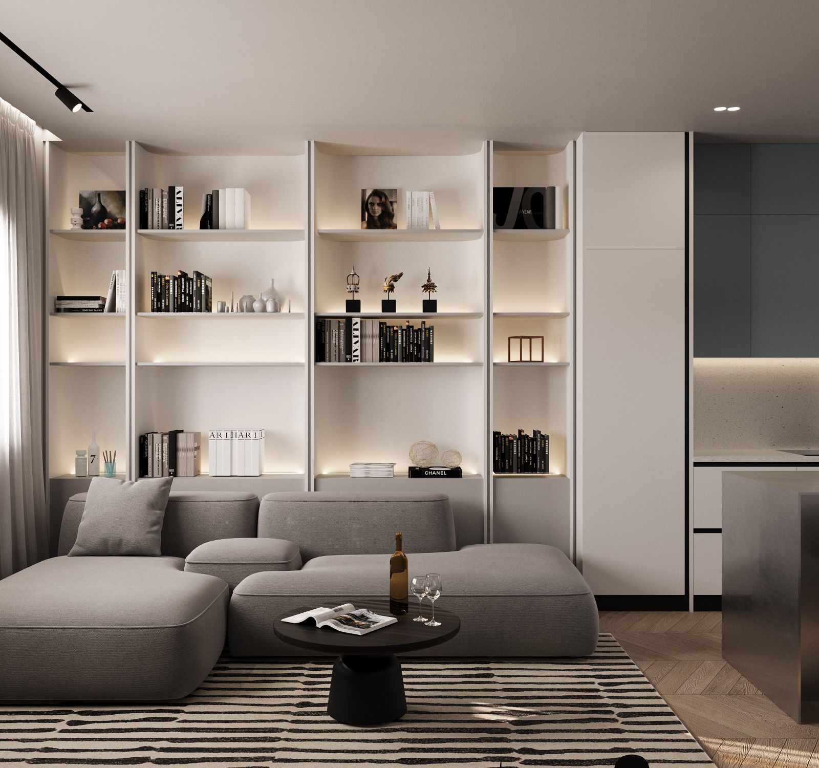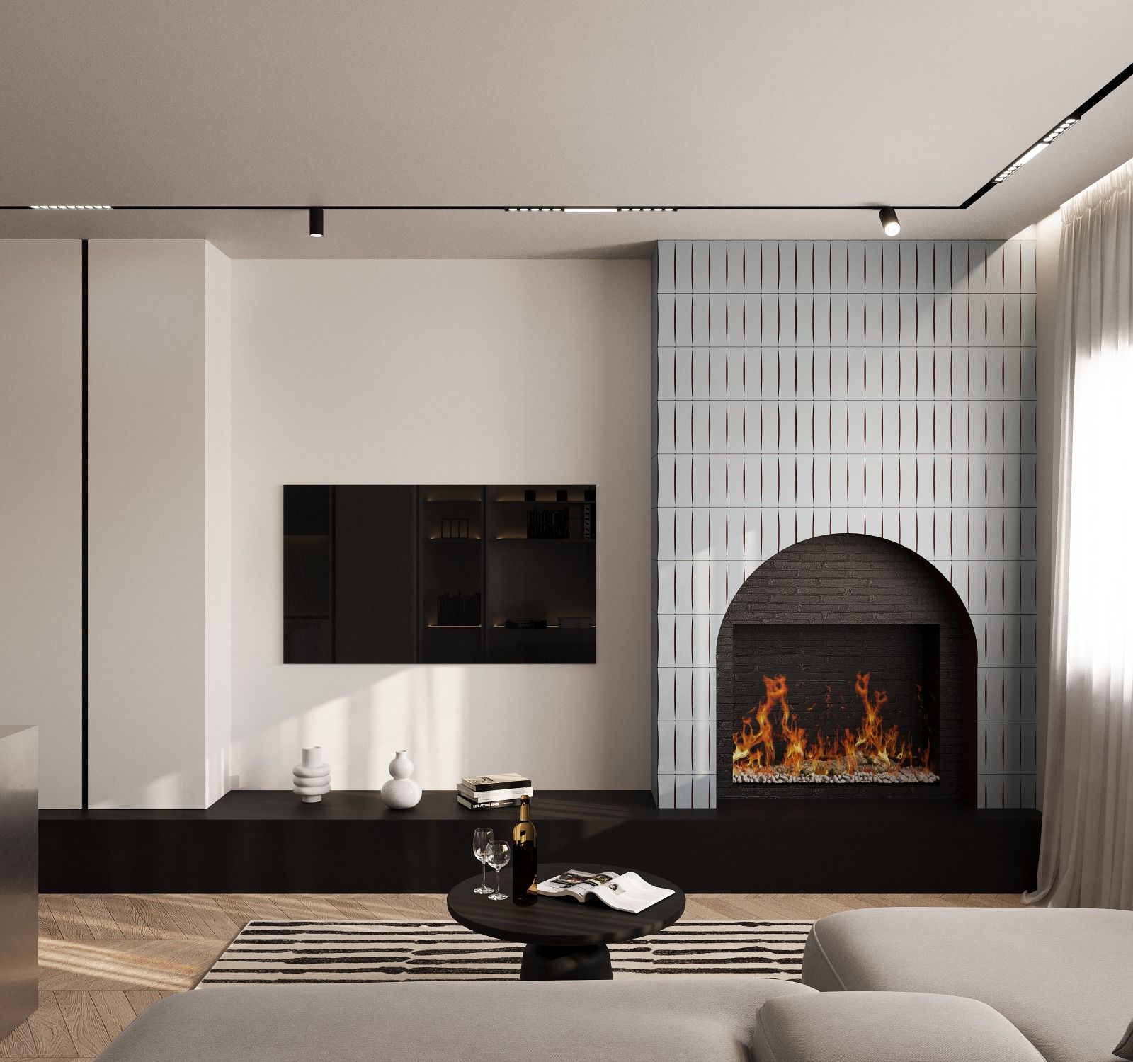 This modern 2+1 apartment in Tirana combines elegance and functionality. The living area features a contemporary fireplace and a beige-grey palette that creates warmth and harmony. Natural wood details and soft lighting enhance comfort, while burgundy accents in the bathroom add sophistication and contrast to the overall modern design.