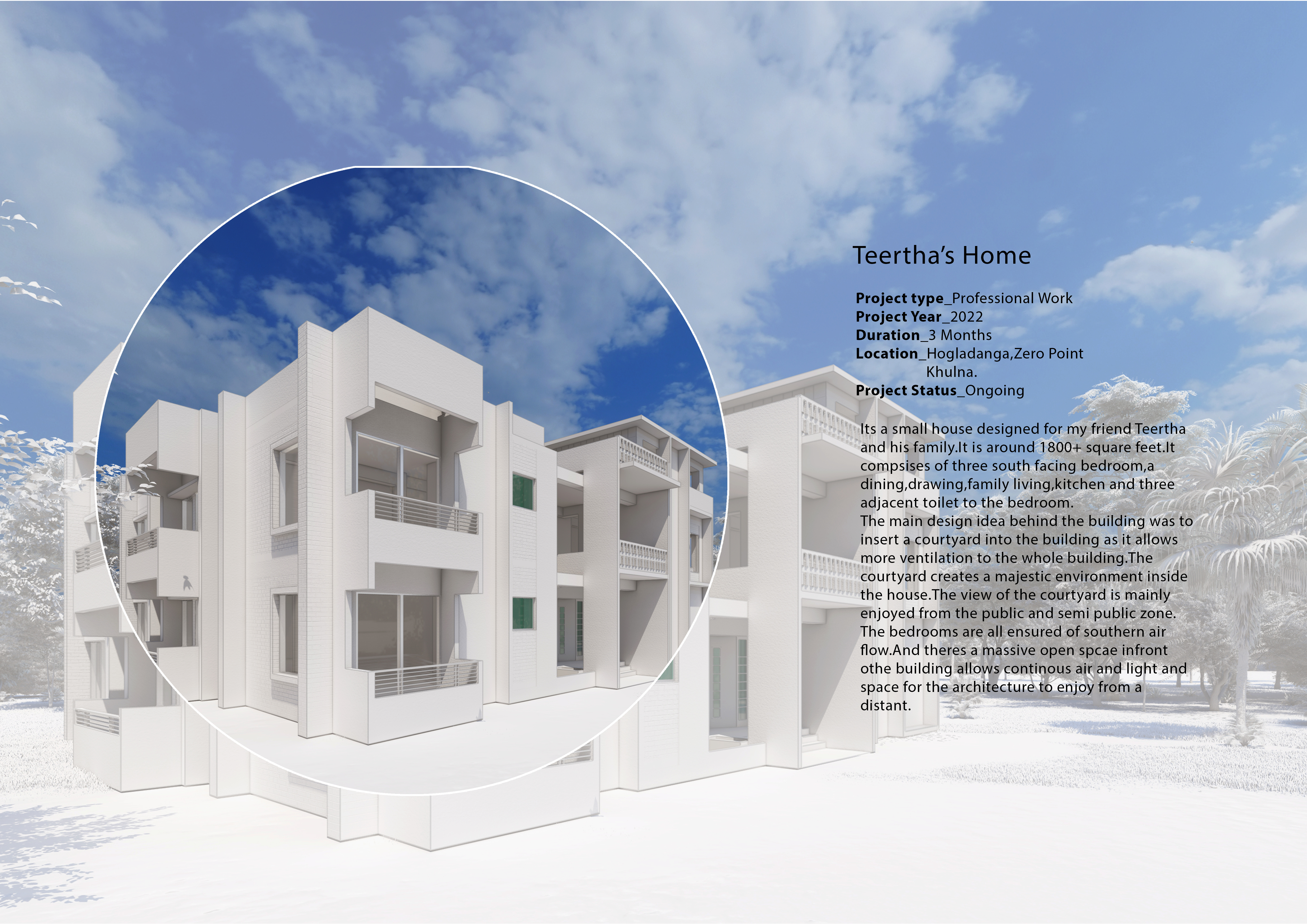 Its a small house designed for my friend Teertha and his family. It is around 1800+ square feet. It comprises of three south facing bedroom, a dining, drawing, family living, kitchen and three adjacent toilet to the bedroom.
