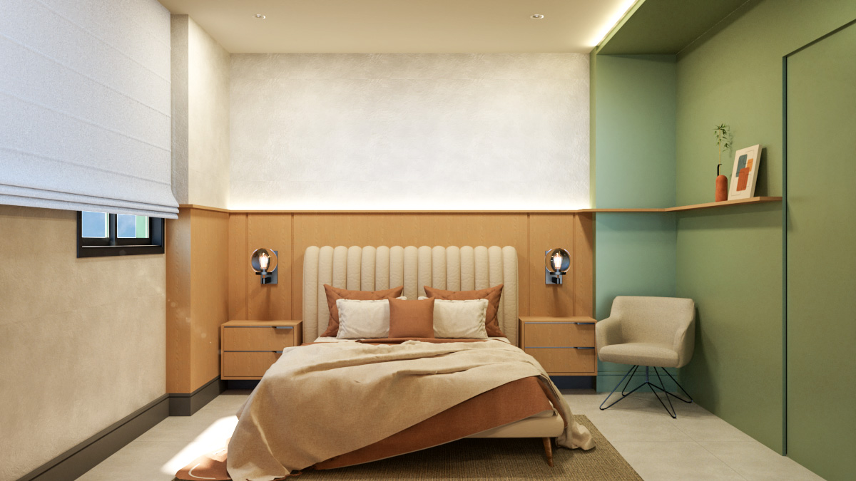 The bedroom features calm and neutral tones, creating a sense of comfort.