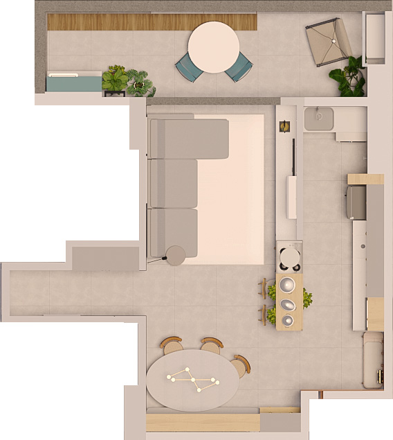 The balcony area is more relaxed and is used to enjoy the view and the bar.