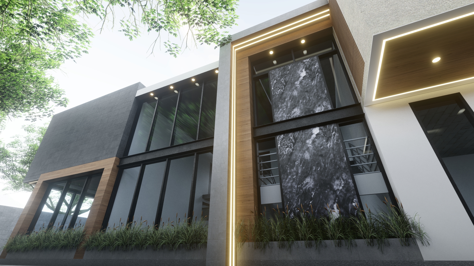 The side facade uses the interplay of volumes, transparencies, and materials to create a more dynamic facade and enhance the project's aesthetic appeal.