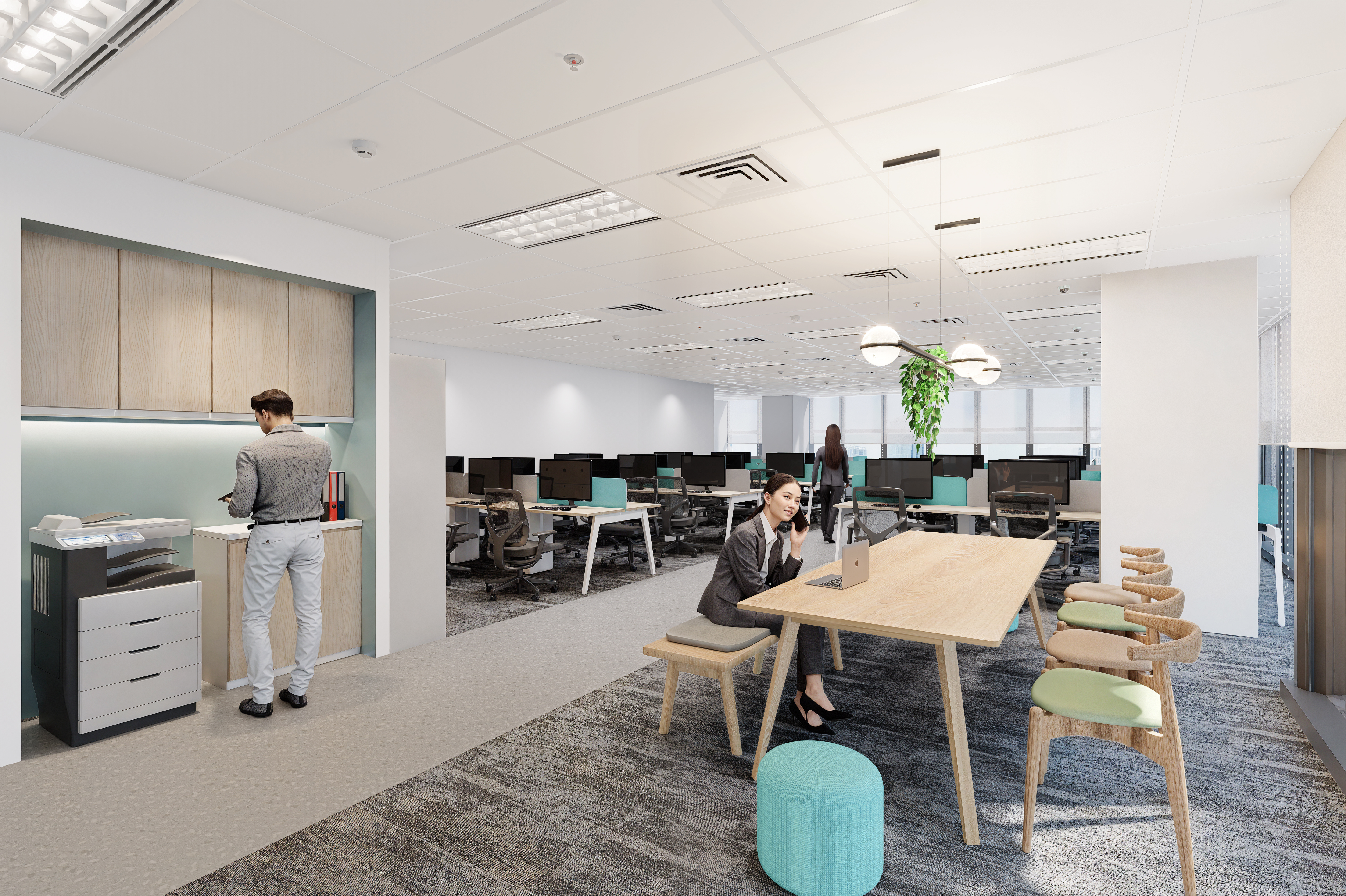 This is a modern, open-plan office that highlights a central wooden collaboration table with bench seating. Behind this is a large zone of private workstations with computers. The space is bright, using a muted color scheme and includes a dedicated printer/service station to the side.