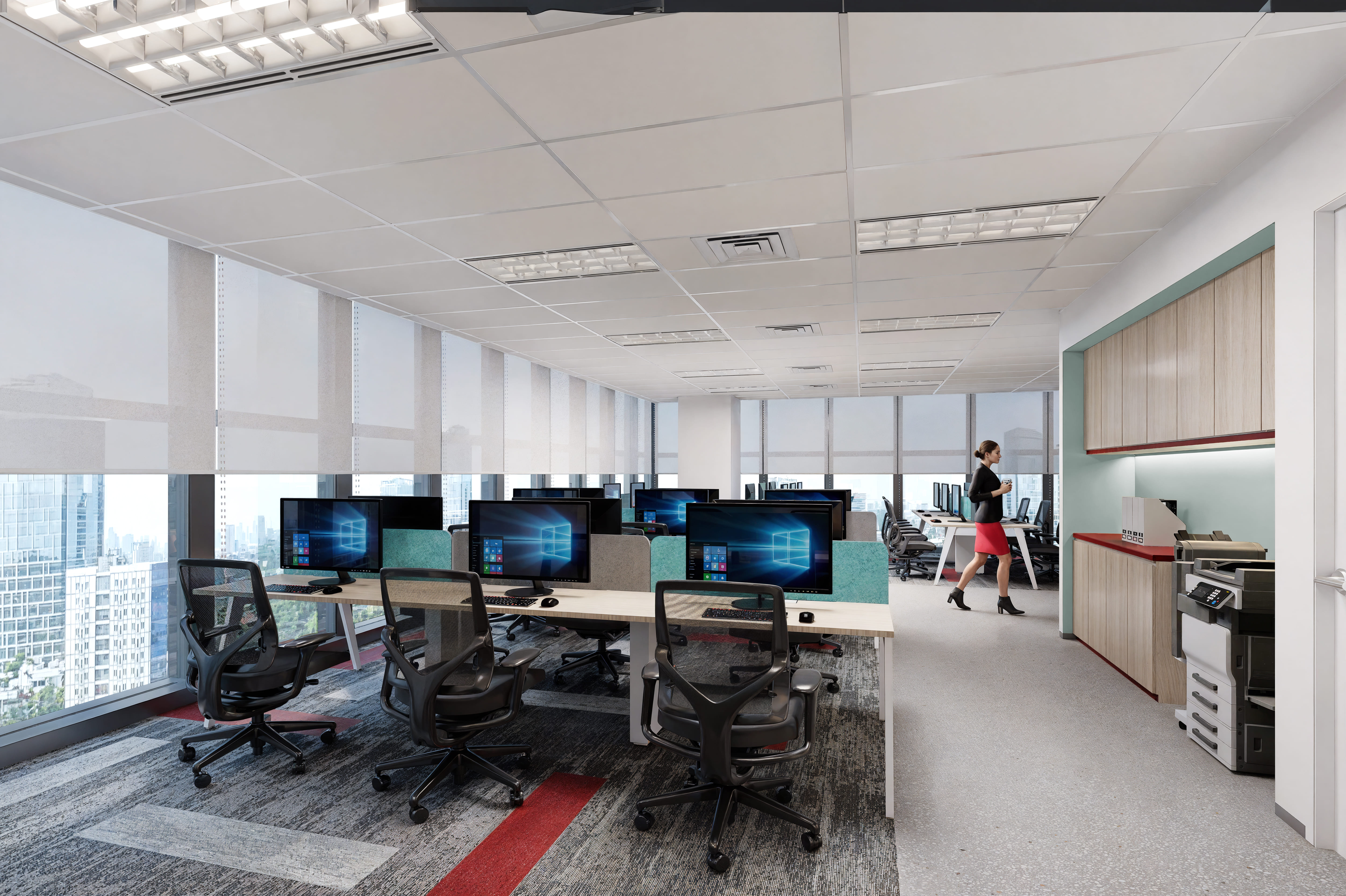 This is a large, typical open-plan office for individual work, featuring rows of workstations with computers and black ergonomic chairs. The space is brightened by large windows offering a city view and includes a dedicated service area with cabinets and a printer/copier on the right.
