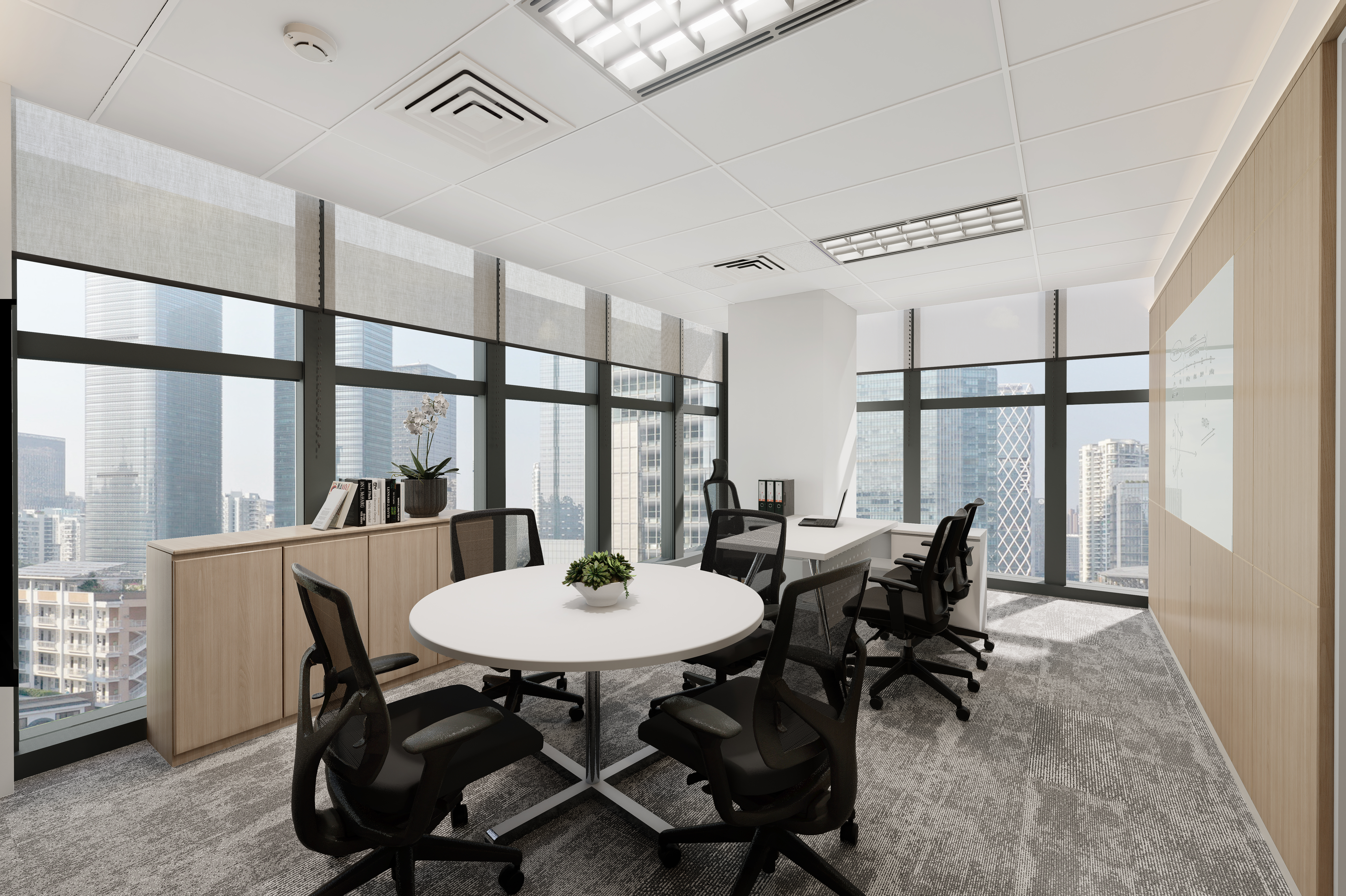 This is a high-end executive meeting room with a massive city view. It features a round wooden table with comfortable chairs and a stylish, built-in side cabinet for storage and display.