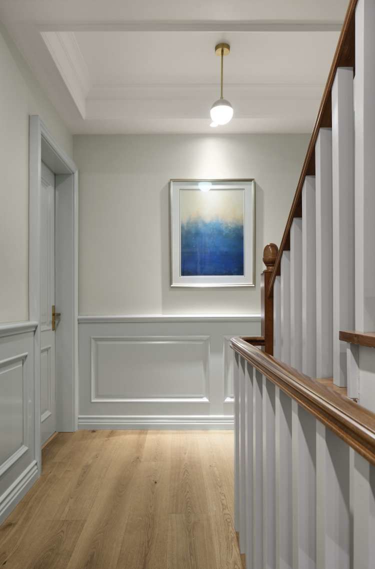 The three-storey guest bedroom is more likely to feel hot in summer. We chose the combination of ice blue, dark gray and white to make the old wood color. Try to make this space not so hot in summer and not so hot in winter. The opposite is cold. There is not too much decoration on the whole, they all describe their own characteristics in a soft voice, and the crystal chandelier is the best embellishment of the space. Let every night have a good mood to relax.