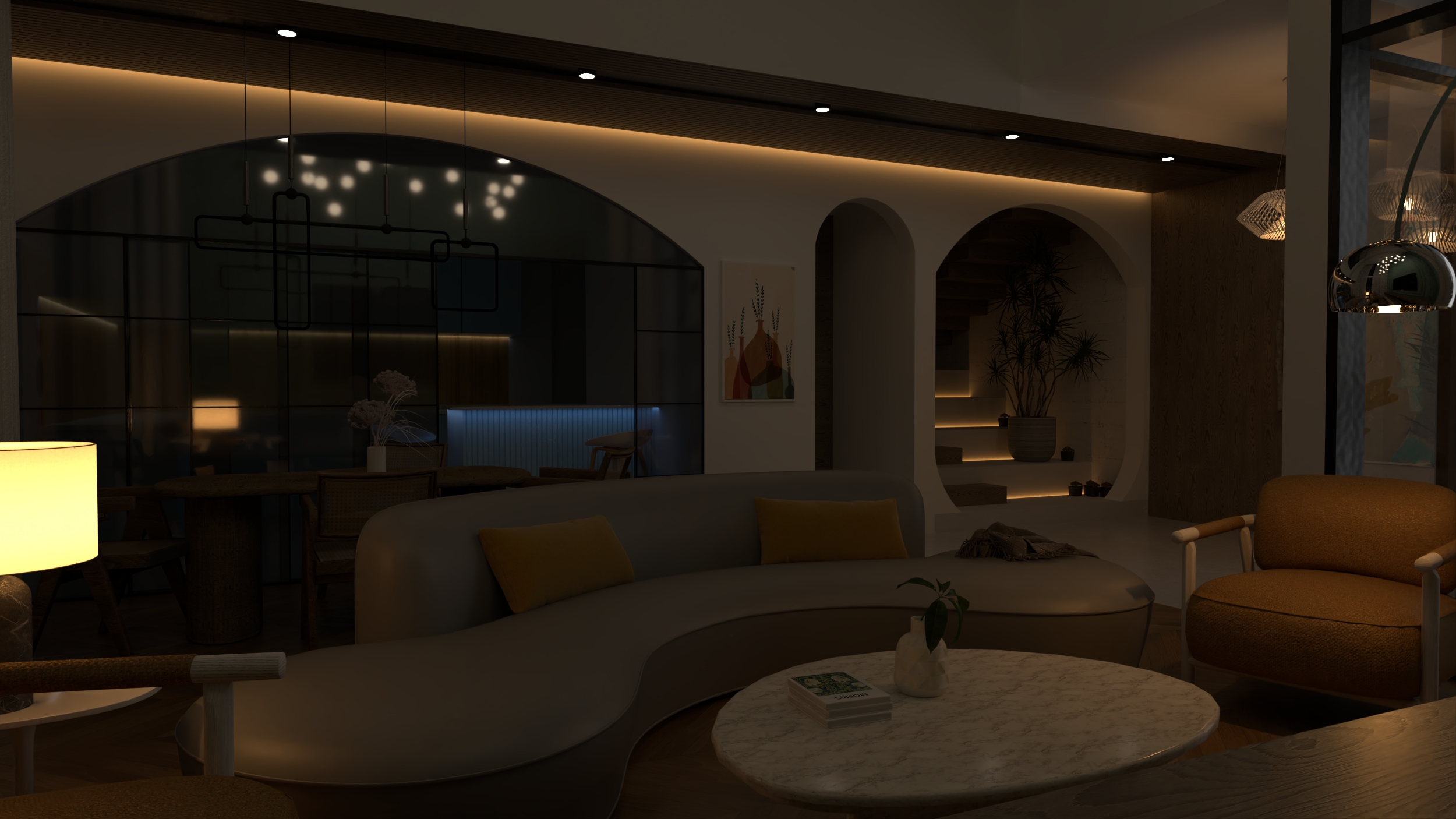 rendering level is professional with vray 6 the design is bohimian and modern in sam way