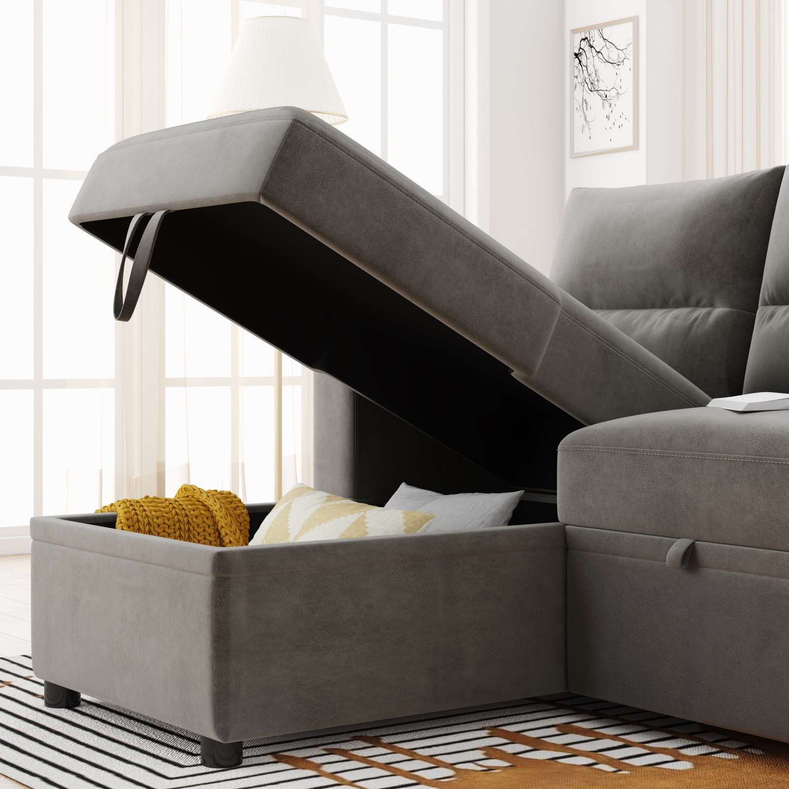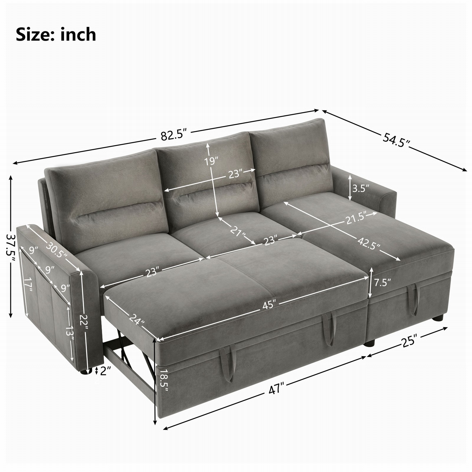 Modern folding sofa beds with 6 Side pockets, Corner living room sofas with storage Chaise