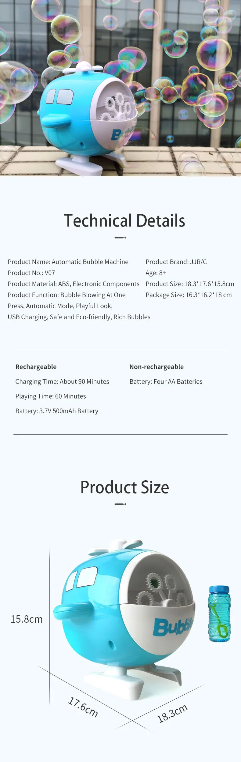 Package Included: 1* Bubble Water 1* USB Cable 1* English Manual Specifications: Material:ABS, Eco-friendly Body Battery:3.7V 500MAH Charging Time:90mins Working Time:About 60mi