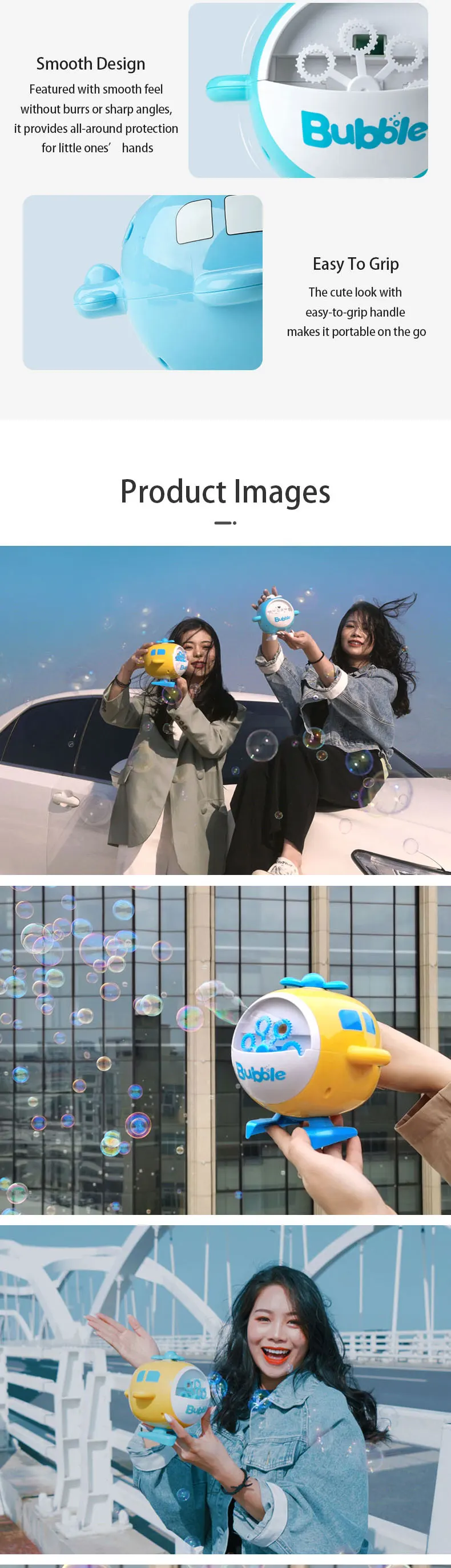 1.It is literally Bubble Mania with the Bubble Jet. The built-in high performance motor produces more than 500 bubbles per minute. 2.Automatic battery operated bubble machine. 3.Very easy to use; simply add bubble solution and press the push button on the top. The air will be filled with bubbles in seconds. 4.With it's fun helicopter design and bright colours, the Bubble Jet is fun to use, as well strong, sturdy and built to last. 5.The extra large bubble reservoir on the Bubble Jet means less time filling it up, and more time catching bubbles!