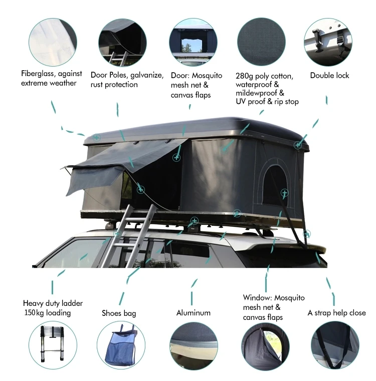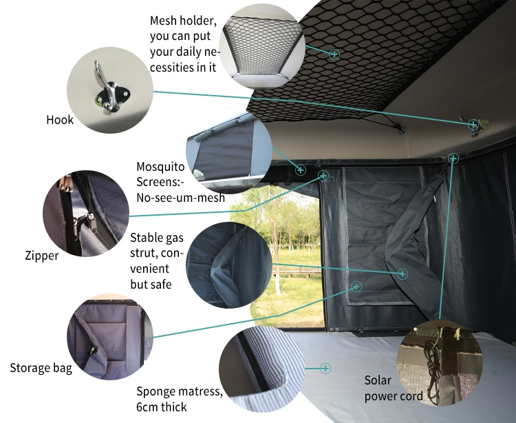 The 4x4 Camper Trailer Tent Hard Shell Car Roof Tent for Camping and Outdoor offers a new way to look at camping and 4WD adventure holidays. Our hard shell roof top tent has two doors with two windows, this creates excellent cross ventilation allowing air to freely circulate throughout the tent. Open and close within seconds with the unique hydraulic support system. Our hard shell roof top tent fit to the roof of most vehicles.