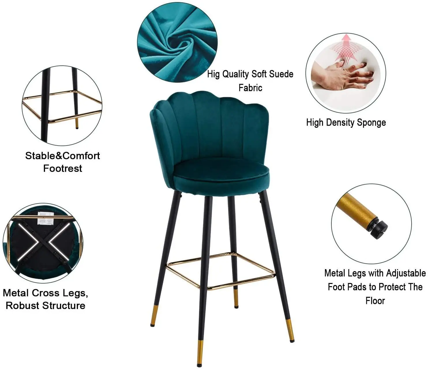 Upholstered Curved Backrest Petal Design Metal Frame Golden Footrest Velvet Bar Stool For Breakfast Home Counter Kitchen Island