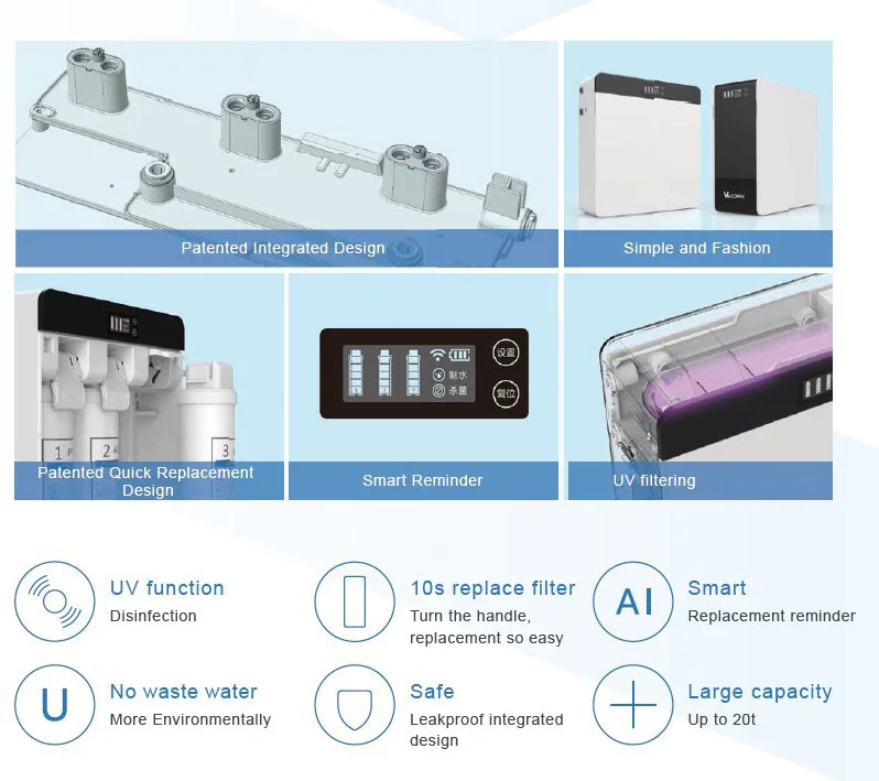 Ultrafiltration home water device can filter out sediment, colloid, bacteria, scale, heavy metal pollut-ants, residual chlorine, organic pollutants and inorganic pollutants effectively, to bring you safe mineral drinking water.