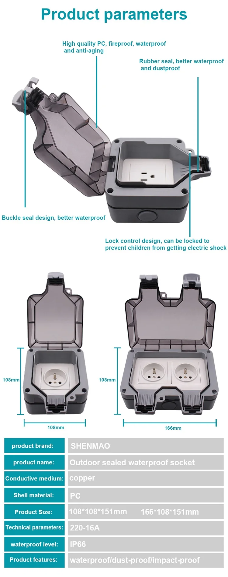 Home MEPF Equipment & Electrical Sockets & Plugs Guangzhou Haizhu Shenmao Hardware Plumbing Appliance Trading Firm Double UK EU German Plug Standard Outlet Switches IP66 Waterproof Ground Plug Outlets Outdoor Weatherproof Wall Socket