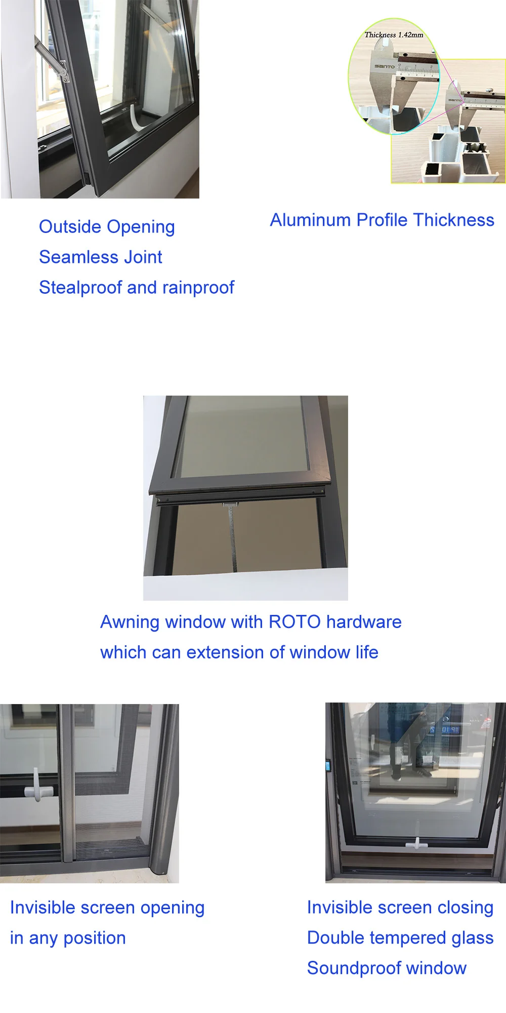 Soundproof silver grey aluminum tempered glazed top hung swing windows for home house