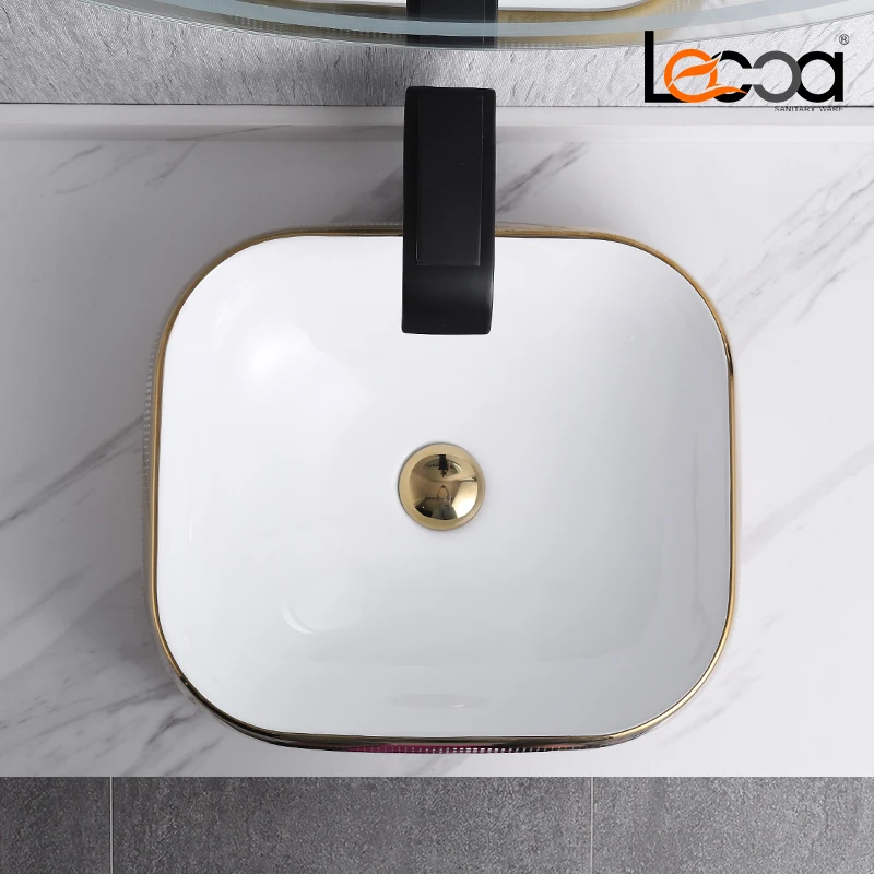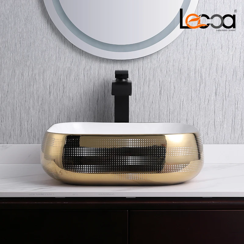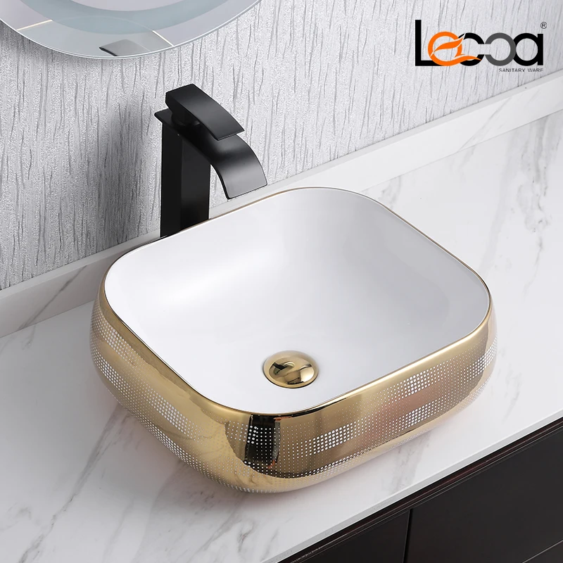 Home Bathroom Products,Sinks Wash Basin Guangdong Olilecca Sanitary Ware Co., Ltd. Bathroom ceramic golden color plated rectangular shape small flower design wash art basin