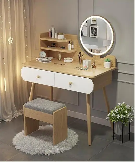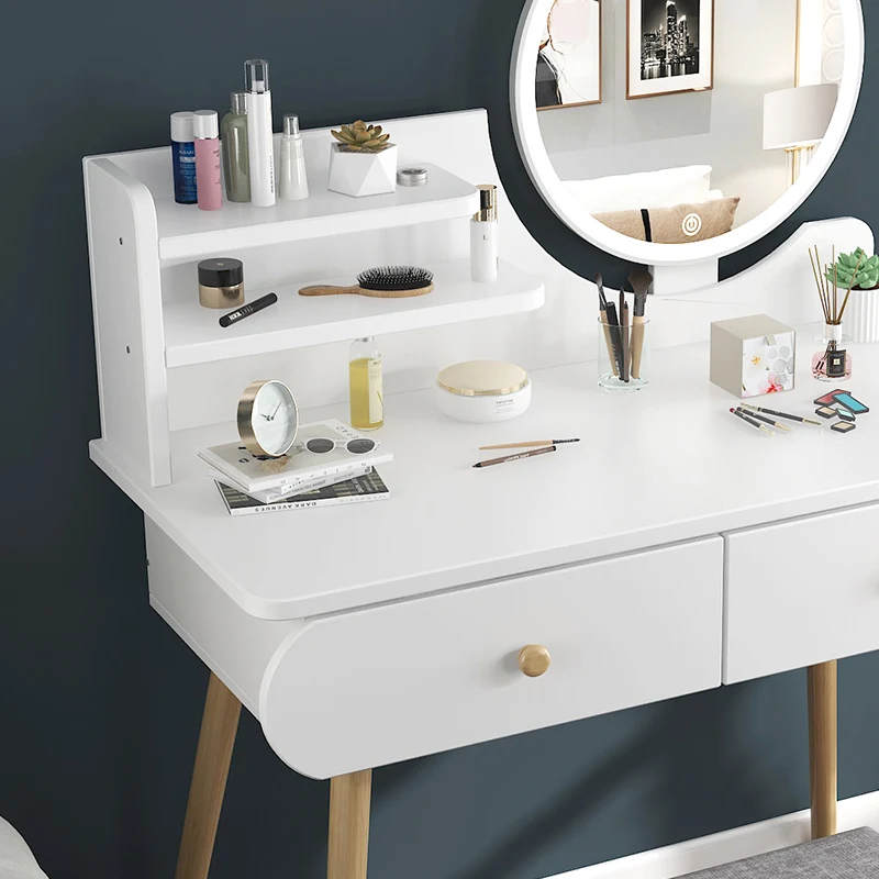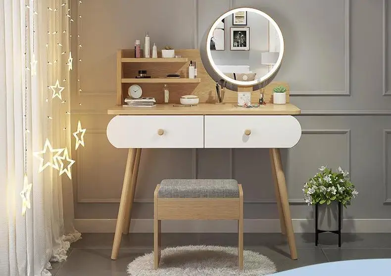 Home Movable Housing Furniture & Household Appliances Bedroom Furniture Dressers Jinan Gu Ling E-Commerce Co., Ltd. Nordic White Furniture Makeup Dressing Table With LED Lighted Mirror And Stool
