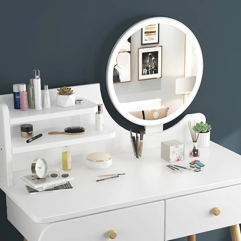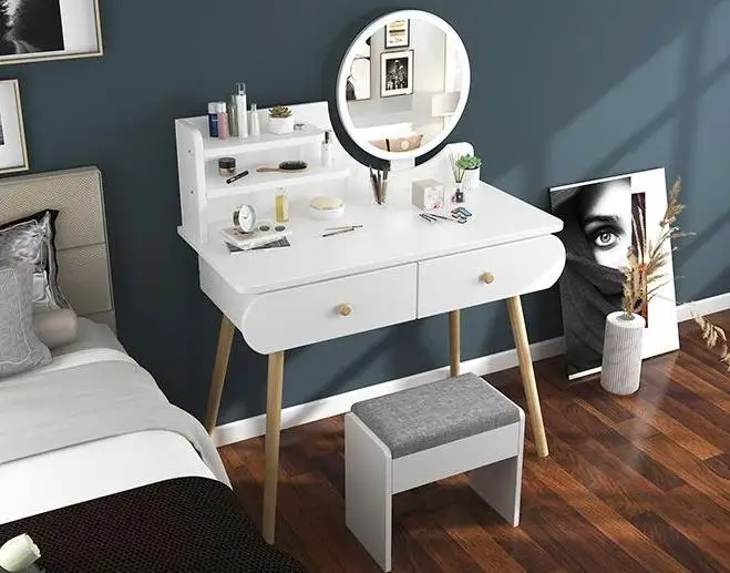 Nordic White Furniture Makeup Dressing Table With LED Lighted Mirror And Stool