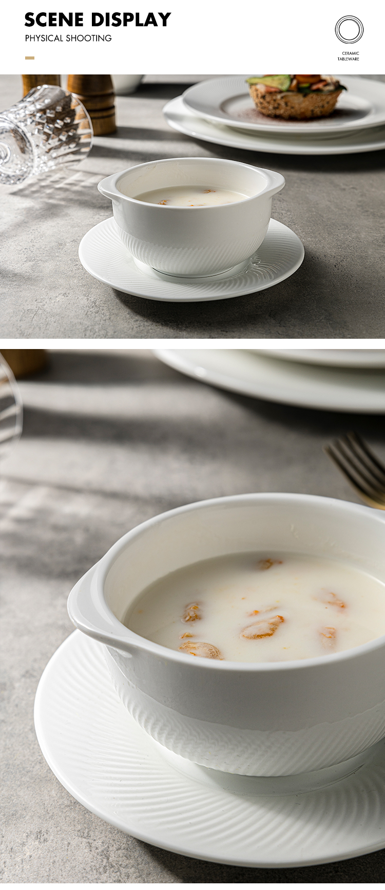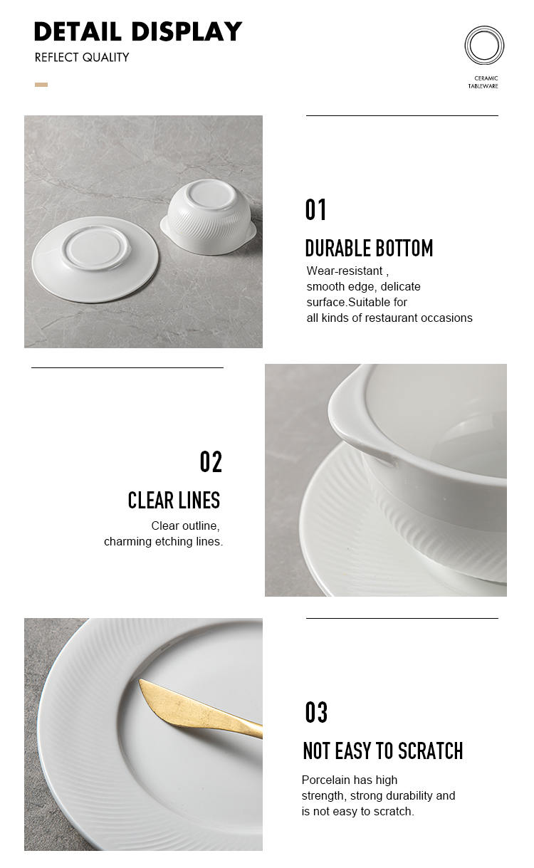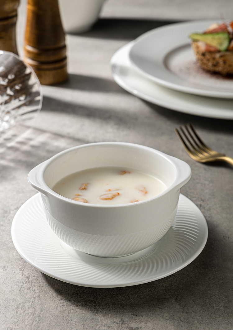 Home Hospitality Supplies Dinnerware Bowl Guangzhou Jiujiuju Homeware Supplies Co., Ltd. JiuJiuJu Porcelain Soup Bowl Set Luxury Elegent Design For Wedding Hote Buffet White Roun Ceramic Soup Bowls with Double Handles