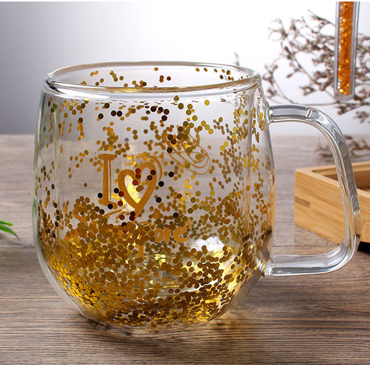 320ml Handblown Gold Powder Decorated Pattern Double Layer Glass Tumbler with Handle Insulating Hot or Cold Beverages Ice Tea