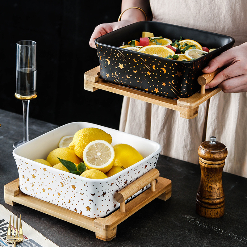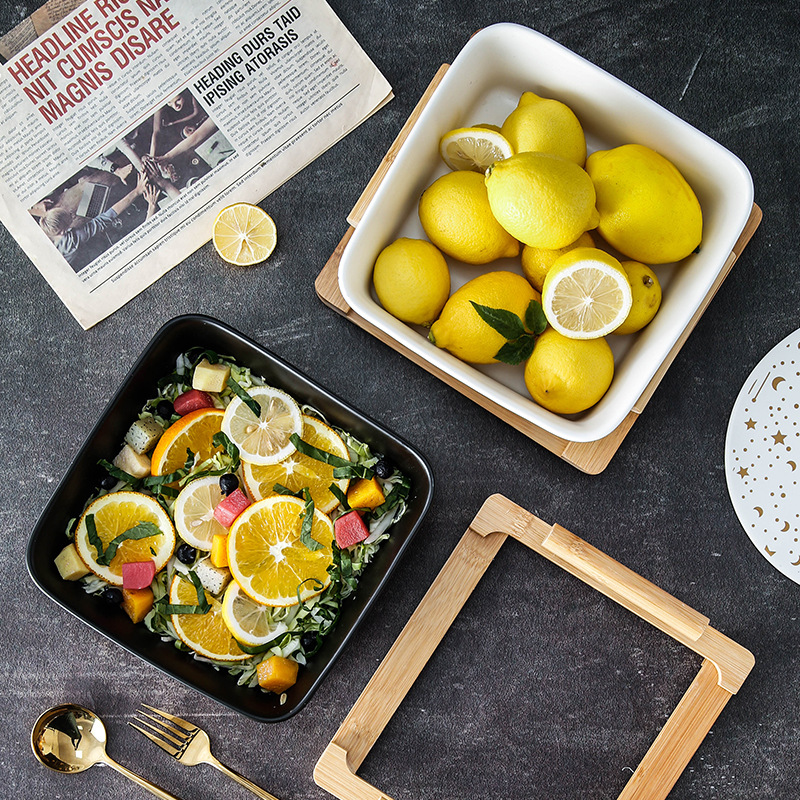 Customized fruit plate 8'' salad bowl dessert plate square ceramic tableware ceramic bowl Porcelain Square Bowl with Wood Stand