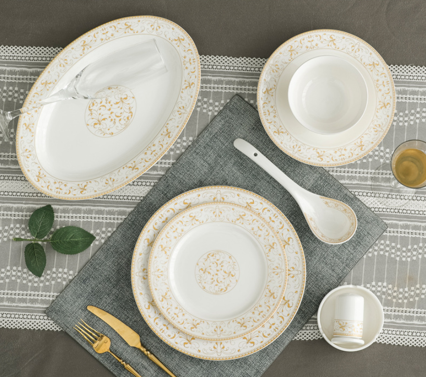 Custom Design Luxury Ceramic Gold Rim Elegant Design Vintage Dinnerware Dinner Set Fine White Bone China
