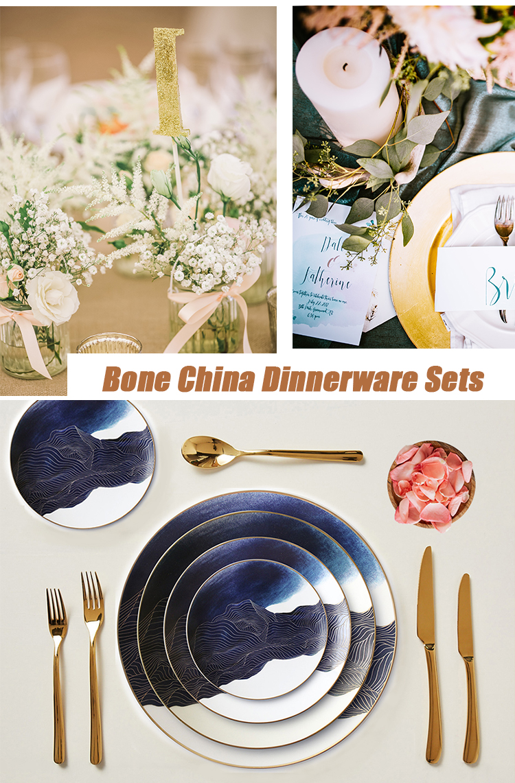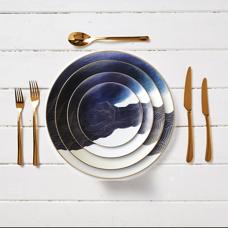 Creative High End White and Blue with Gold Rim Ceramic Plate Bone China Dinnerware Sets for Weddings Restaurant Dinner Party