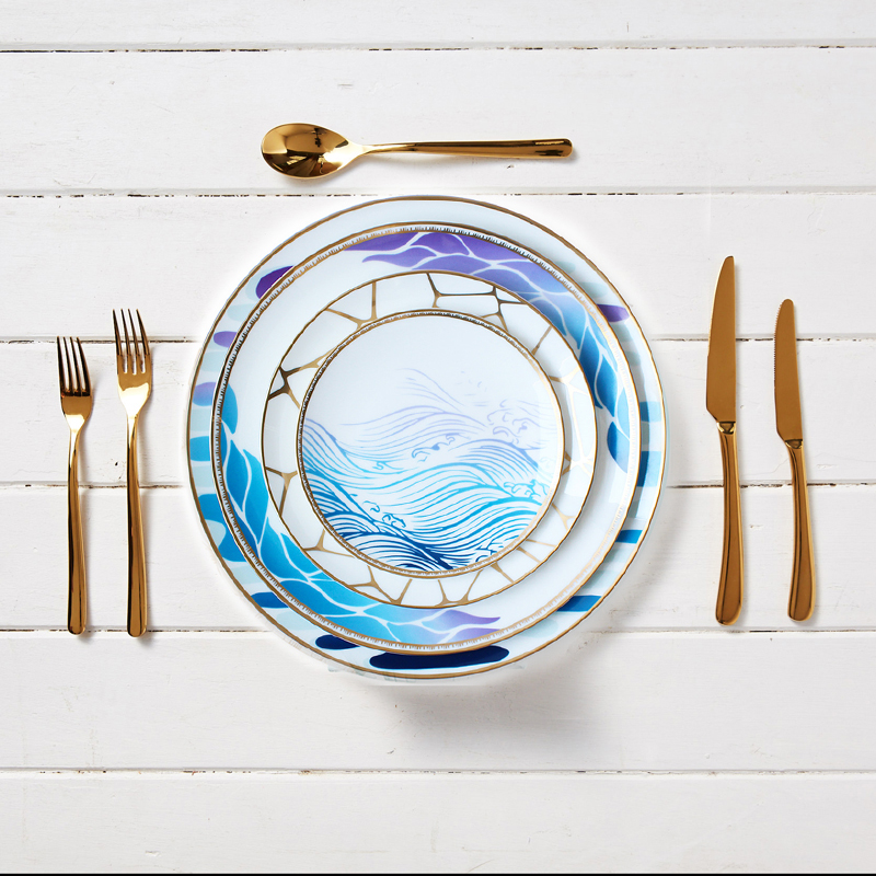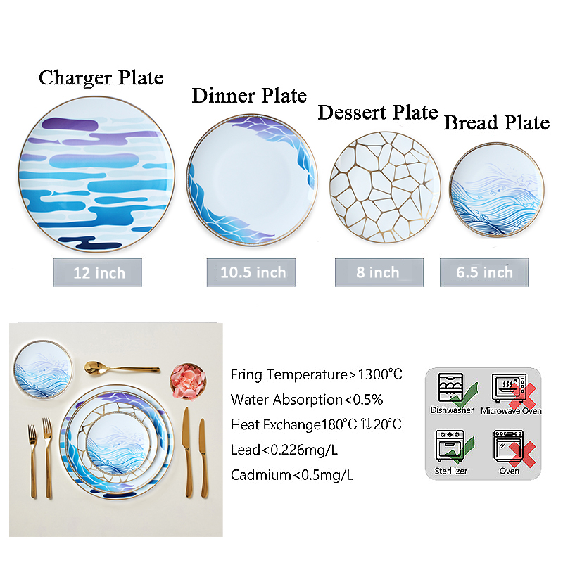 2021 Colorful Water Wave Pattern Bone China Dinnerware Sets with Golden Rim Custom Made High End Porcelain Wedding Charger Plate
