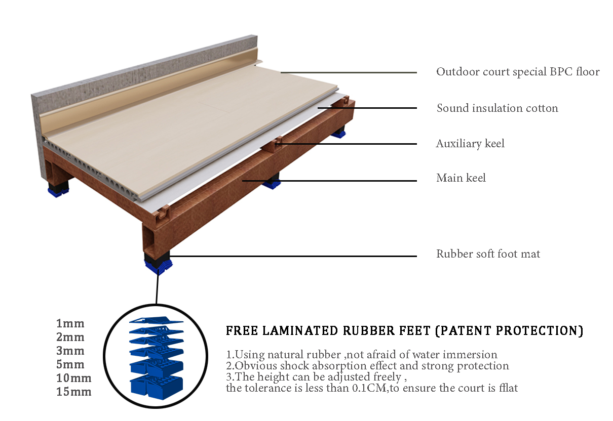 Feature | 1.Meets the requirement of FIBA Level-1 for 3 x 3 & outdoor court 2.Meets the requirement of FIBA Level-2 for wooden flooring 4.Patented plastic leveling adjuster for a smooth and leveled court 5.Heavy-duty, UV-resistant wear layer on the top surface offers regulation grip and traction 6.Not prone to thermal 7.Durable against water, UV light, termites, high impact, heavy load, chemical 8.Low maintenance cost except regular cleanings 9.Non-toxic, food-grade material with compliance with EN REACHand ROHS code. 10.Anti-fungus, antibacterial and anti-mildew 11. 3 Standard color options and custom color available 12.Customlogo, graphics and color scheme available |
