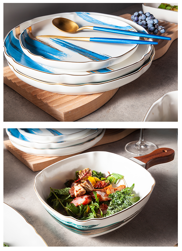 Factory Ceramic White Green Blue Hand Painted Tableware Wave Gold Rim Home Restaurant Juego De Vajilla Porcelain Dinnerware Set