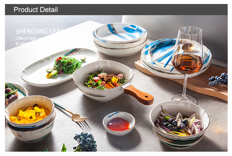 Home Hospitality Supplies Dinnerware Dinnerware Set Guangdong Shengjing Industrial Co., Ltd. Factory Ceramic White Green Blue Hand Painted Tableware Wave Gold Rim Home Restaurant Juego De Vajilla Porcelain Dinnerware Set