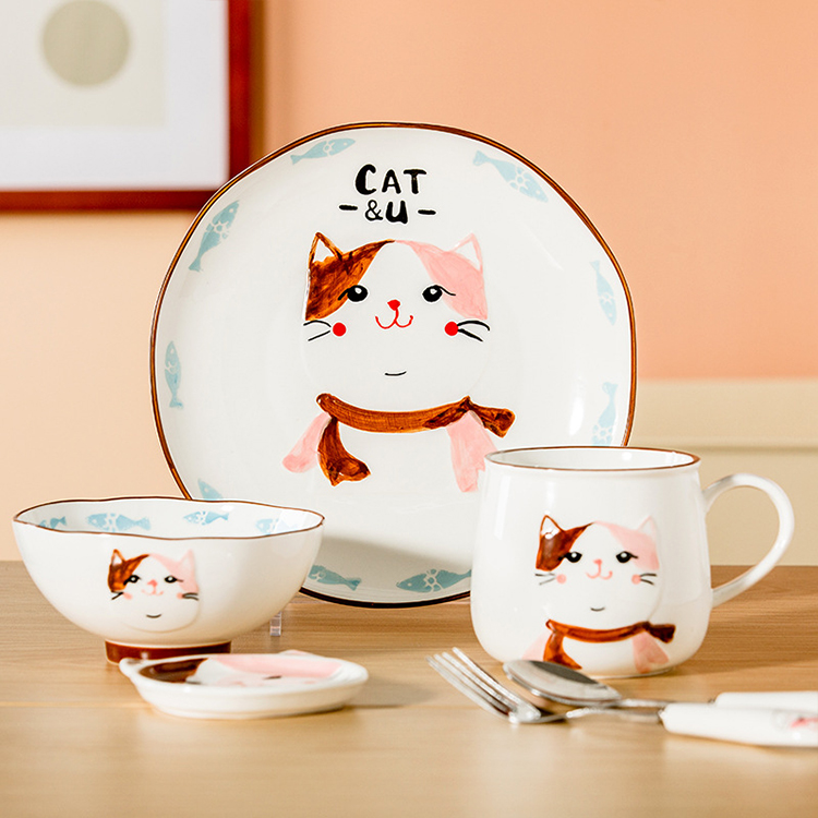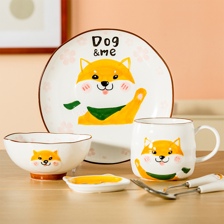 2022 custom creative cute hand painted cartoon breakfast plate stoneware mug ceramic dinnerware set for children
