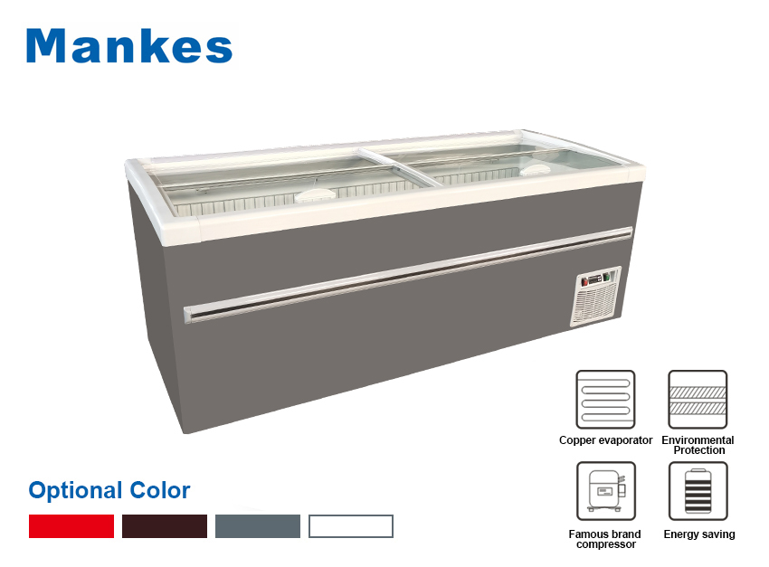 supermarket free standing flat top open glass door freezer display deep chest frozen food fridge