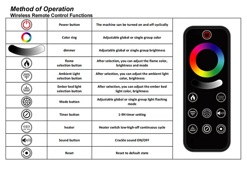 Make the flame presentation brilliant and 7 color options for the ember bed and downlighting, support built-in different types of flames as your wish, the virtual technology gives you the premium flame you desire.