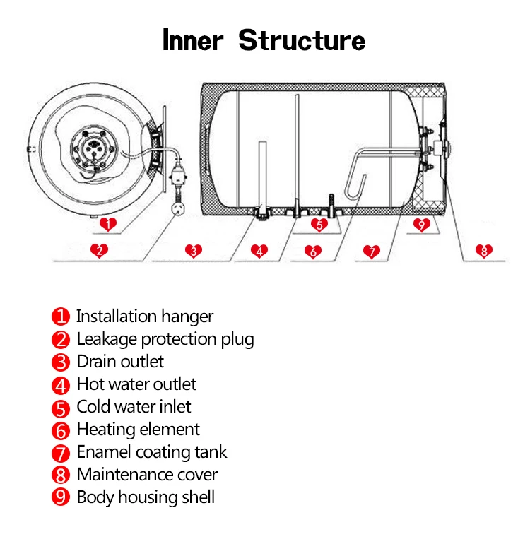 4: Enameled inner tank: Electric water heater tank is a pressure vessel, with thickening of the high manganese steel materials, electrostatic dry powder enamel plasma welding process, anti-rust, corrosion, pressure.