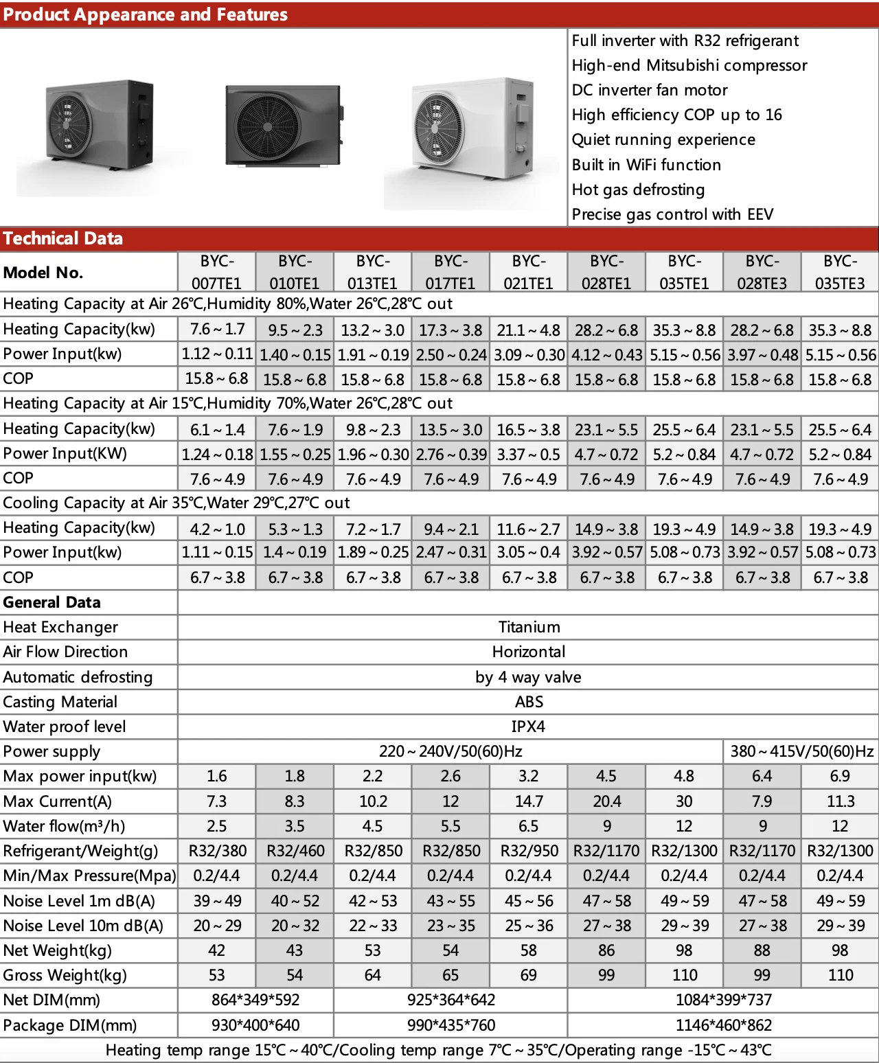 R32 DC inverter pool heat pump's datasheet for heating and cooling capacity under different conditions.