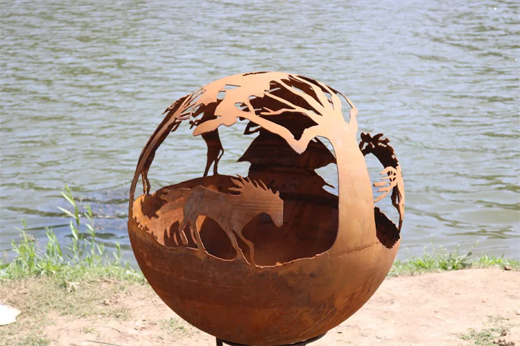 Corten Sphere fire pit features elephants, a lion, a giraffe,etc animals and trees decorations. This unique, decoration fire pit is made with 3mm thick weathering steel and has a rust patina finish.