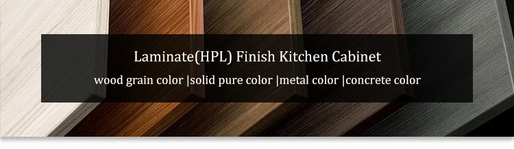 Laminate kitchen cabinets come in many colors choice, such as pure color, wood grain color,concrete color, etc, please kindly contact Allandcabinet sales to learn more. And HPL finish cabinets also offer other benefits to homeowners, such as being less likely to fade, improved resistance to scratches, more durability, and cleaning up with ease.